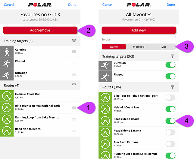 You can choose the routes you want to have on your watch in the Polar Flow app or web service. Your watch can have a maximum of 100 favorites at a time.