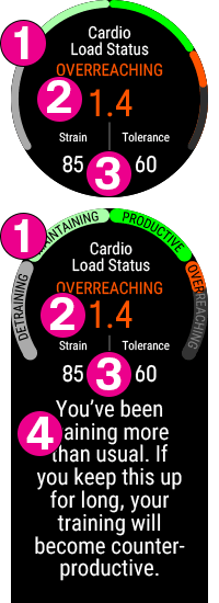 - Cardio load status and the numeric value for your Cardio load status (=Strain divided by Tolerance.)
