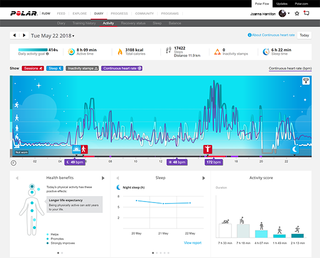 Vous pouvez consulter les valeurs fournies par la fonction Fréquence cardiaque continue plus en détails et sur de plus longues périodes dans Polar Flow, que ce soit sur le Web ou dans l'application mobile. Apprenez-en plus sur la fonction Suivi de la fréquence cardiaque continu dans ce guide exhaustif.