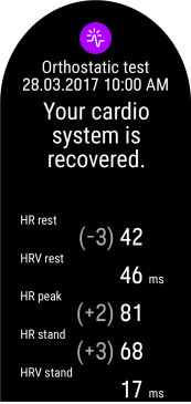 Quando avrai eseguito almeno due test ortostatici in un periodo di 28 giorni, otterrai feedback sul recupero del tuo sistema cardiaco sullo sportwatch dopo il test.