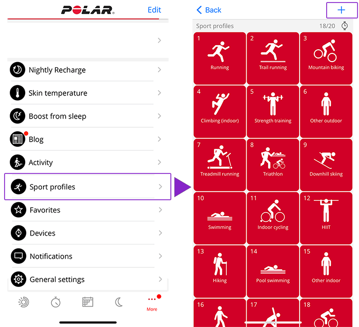 Puoi anche definire impostazioni specifiche per ogni profilo sport. Puoi creare visualizzazioni allenamento personalizzate per ogni sport che pratichi e scegliere i dati da visualizzare durante l’allenamento. Consulta il documento di supporto Come posso modificare i profili sport e le visualizzazioni allenamento in Polar Flow? per informazioni dettagliate sulle impostazioni del profilo sport dello sportwatch.