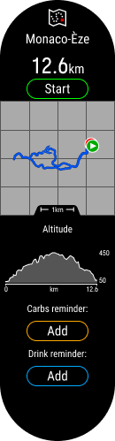 ルート開始地点、ルート終着点、またはルートの至近地点(中間ルート)から選択することができます。まずはじめに、ウォッチはルート上のあなたが選択した開始地点にガイドします。一度ルートにのると、ウォッチがあなたの全行程をガイドし、ルートから外れないようモニタリングします。ディスプレイ画面のガイダンスに従ってください。ディスプレイ画面の下に、残りの距離が表示されます。