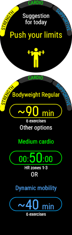 Kello ehdottaa sinulle parhaiten sopivia treenitavoitteita treenihistoriasi, kuntotasosi ja palautumisesi tilan perusteella. Näet kaikki ehdotetut treenitavoitteet napauttamalla näyttöä. Näet tarkat tiedot treenitavoitteesta napauttamalla treenitavoitetta.