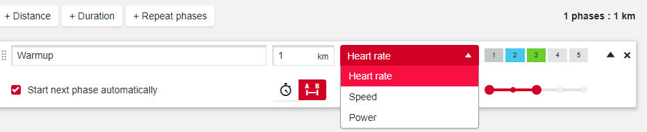 - Valitse vaiheen intensiteetin pohjaksi syke, nopeus tai teho.