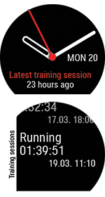 V časovnem pogledu podrsajte levo ali desno, da krmarite do prikaza ure Latest training sessions (Zadnje vadbe), nato pa se dotaknite zaslona. Ogledate si lahko povzetke vaših vadb zadnjih 14 dni. Izberite vadbo, ki si jo želite ogledati, tako da podrsate navzgor ali navzdol, nato pa se dotaknite zaslona, da odprete povzetek. Vaša ura ima lahko največ 20 povzetkov vadb. |