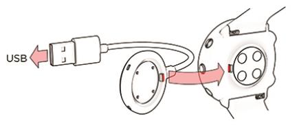 1. 상자에 동봉된 맞춤형 케이블을 사용하여 워치를 컴퓨터에 연결하세요. 케이블이 제자리에 끼워졌는지 확인하세요. 케이블의 돌출부와 워치의 슬롯(빨간색으로 표시)을 맞춥니다.