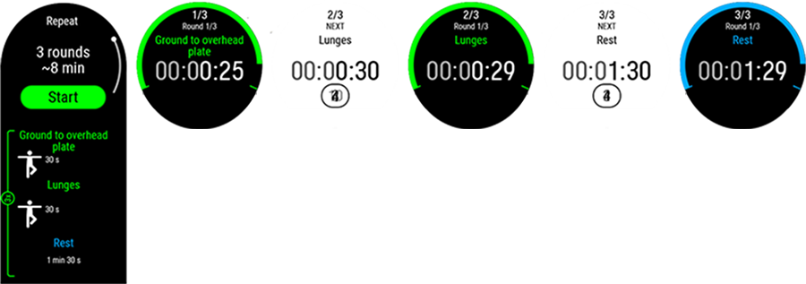 근육 강화 트레이닝 및 보조 트레이닝 세션은 운동 애니메이션과 실시간 단계별 안내가 있는 미리 준비된 운동 계획을 기반으로 합니다. 모든 세션에는 타이머와 진동이 포함되어 있어 다음 단계로 전환할 시점을 알려줍니다. 각 동작을 40초 동안 계속한 다음, 1분이 끝날 때까지 쉬고 나서 다음 동작을 시작합니다. 첫 번째 세트의 모든 동작을 완료했으면 다음 세트를 수동으로 시작합니다. 원할 때 언제든지 트레이닝 세션을 끝낼 수 있습니다. 트레이닝 단계를 건너뛰거나 재정렬할 수는 없습니다.
