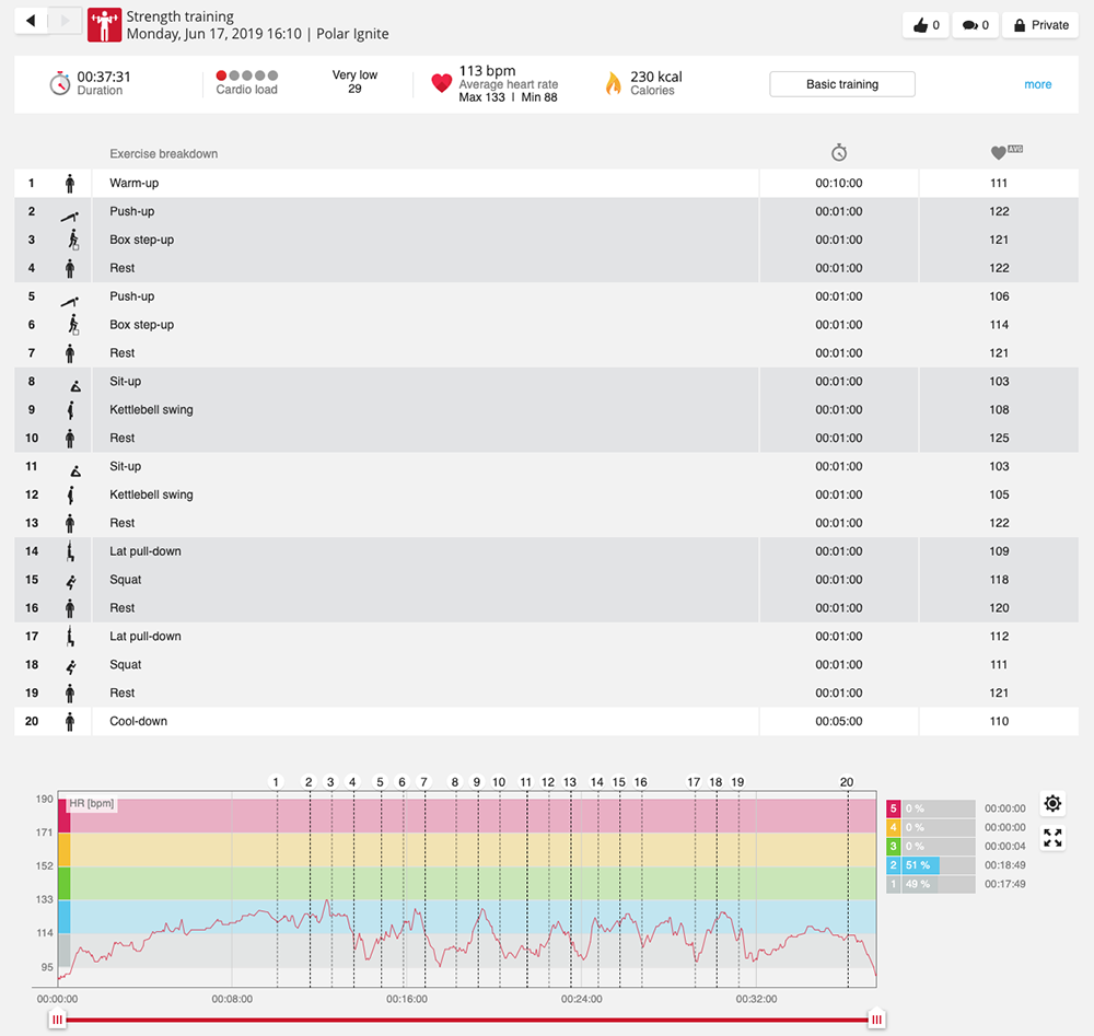 세션이 끝난 직후 워치에서 트레이닝 세션 요약을 볼 수 있습니다. Polar Flow 앱 또는 Polar Flow 웹 서비스에서 더 자세한 분석 보고서를 얻을 수 있습니다. 심장 강화 트레이닝 목표의 경우, 심박수 데이터가 있는 세션의 단계를 보여주는 기본 트레이닝 결과를 얻을 수 있습니다. 근육 강화 및 보조 트레이닝 목표의 경우, 평균 심박수와 각 운동에 들인 시간을 포함한 자세한 트레이닝 결과를 얻을 수 있습니다. 이는 목록으로 표시되며 각 운동은 심박수 곡선에도 표시됩니다.