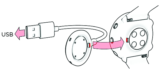 若需唤醒您的手表并充电,请利用随盒子附上的连接线,把手表插进供电的 USB 端口或 USB 充电器中。连接线以磁力方式卡入到位,只需确保将连接线上的突出部分与手表上的插槽对齐即可(用红色标记)。请注意,可能需要一定的时间显示屏上才会显示充电状态动画。我们推荐您在开始使用手表前对电池进行充电。有关电池充电的详细信息,请参见电池。