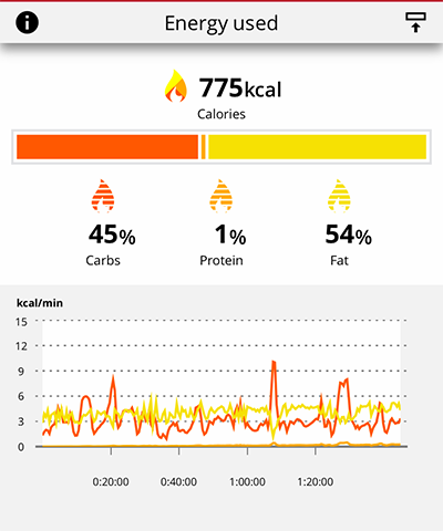 Calcoliamo l’uso delle diverse fonti di energia in base alla frequenza cardiaca, ma teniamo conto anche delle tue caratteristiche fisiche. Sono inclusi età, sesso, altezza, peso, frequenza cardiaca massima, frequenza cardiaca a riposo, valore VO2max, soglia aerobica e soglia anaerobica. È importante aver configurato queste impostazioni il più precisamente possibile per ottenere i dati sul consumo delle fonti di energia più accurati.