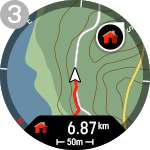 - Zahájit postupnou navigaci: Aktivuje podrobnou navigaci pro aktuální trasu. Hodinky poskytují pokyny prostřednictvím zvukových a vibračních upozornění a ukazují, kterým směrem zahnout. Postupná navigace pro trasy Komoot je ve výchozím nastavení zapnuta. Pokud je podrobná navigace aktivní, v nabídce se zobrazí možnost Ukončit podrobnou navigaci.