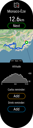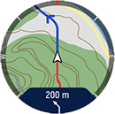 您可選擇前往路線起點、路線終點或最接近的路線地點(中途點)。首先,您的手錶會指引您前往您所選擇的路線起點。抵達路線後,手錶將全程指引您,確保您沒有偏離路線。您只需跟從螢幕上的指引。於螢幕底部可以看到剩餘的距離。