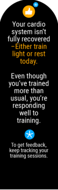 Et ikon, der viser din parathed til kredsløbstræning i dag, og som afspejler din daglige træningsanbefaling, der fortæller, hvordan vi anbefaler dig at træne. Ikonet for træningsanbefaling erstattes af et ikon for øget sandsynlighed for skade eller sygdom, når du er i øget risiko for at blive skadet eller syg. Den korte træningsanbefaling kan lyde:
