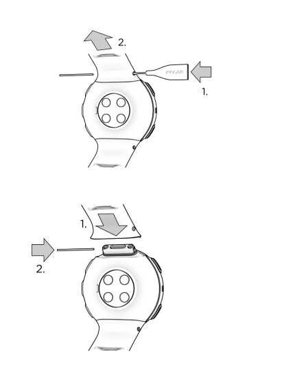 - For at fastgøre et armbånd skal du indsætte stiften fra den modsatte side i stifthullet på armbåndet og skubbe det på plads.