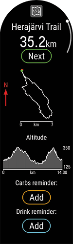 Puedes optar por ir al punto de partida de la ruta, al punto final de la ruta o al punto más cercano de la ruta (a mitad de la ruta). En primer lugar, el reloj te guiará hacia el punto de partida seleccionado de la ruta. Una vez en la ruta, el reloj te guiará durante todo el trayecto para que te mantengas en la ruta. Solamente debes seguir las indicaciones de la pantalla. En la parte inferior de la pantalla verás la distancia que te queda por recorrer.