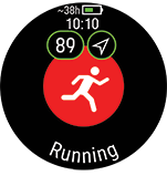 腕時計とペアリングされたPolar心拍センサーの装着時は、トレーニング セッションの間、センサーが自動的に心拍数を測定します。心拍数の記号の周りの青色の円は、腕時計が心拍数測定のために接続されたセンサーを使用していることを示します。 - 全てのシグナルが検出されたら、OK(右中央)ボタンを押して、トレーニングの記録を開始します。