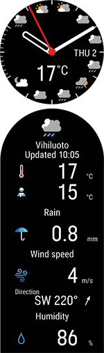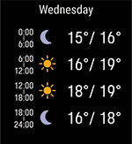 Med klokkevisningen for vær kan du sjekke dagens prognose time for time, morgendagens 3-timers prognose og en 6-timers prognose for dagen deretter. Du får tilgang til ytterligere informasjon om været, blant annet vindstyrke, vindretning, fuktighet og sannsynlighet for regn.