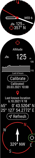 Sprawdź szybko swoją aktualną wysokość i kierunek. Naciśnij przycisk OK, aby wyświetlić więcej szczegółów – profil wysokości w ciągu ostatnich 6 godzin, współrzędne ostatniej znanej lokalizacji i kompas.