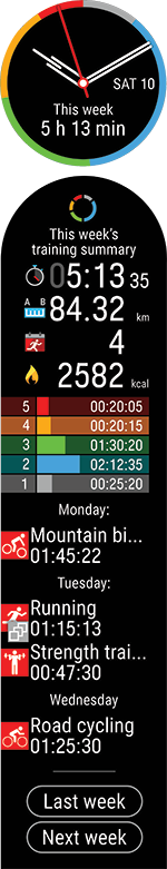 Zobacz podsumowanie tygodnia treningów. Na wyświetlaczu zobaczysz Twój całkowity czas treningów w danym tygodniu podzielony na różne strefy treningowe. Naciśnij przycisk OK, aby wyświetlić szczegóły. Zobaczysz dystans, sesje treningowe, całkowitą liczbę spalonych kalorii i czas spędzony w każdej strefie tętna. Co więcej, możesz zobaczyć podsumowanie ubiegłego tygodnia i szczegóły oraz sesje zaplanowane na kolejny tydzień.