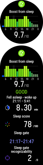 Graf Posilnění spánkem znázorňuje, jak vás spánek za poslední noci povzbudí v průběhu dne. Čím světlejší je odstín a čím vyšší je sloupec, tím vyšší je úroveň posilnění. Posilnění spánkem představuje shrnutí denní předpovědi do jednoho čísla, aby bylo možné snadno porovnávat jednotlivé dny. Chcete-li zobrazit podrobnější informace, klepněte na displej.