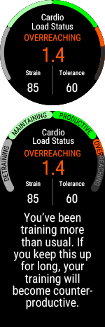 Stav kardio zátěže vyjadřuje vztah mezi krátkodobou tréninkovou zátěží (námahou) a dlouhodobou tréninkovou zátěží (tolerancí) a na základě těchto údajů vás informuje o tom, zda je vaše tréninková zátěž nedostatečná, udržovací, produktivní, nadměrná či regenerační.