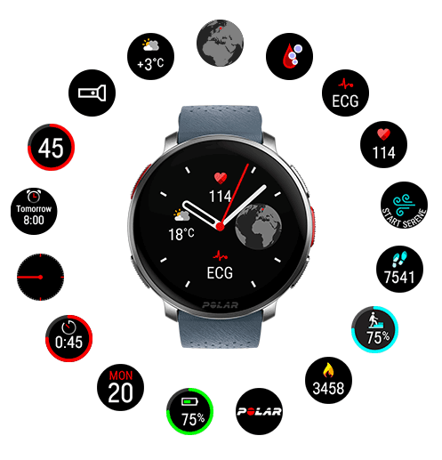 您可以从一组预定义选项中选择不同的样式和颜色来定制您自己的 Polar Vantage V3 表盘。此外,您也可以选择表盘上显示的小部件。小部件让您一目了然地查看信息,还可通过它们快速访问功能。请在表盘设置中了解详情。