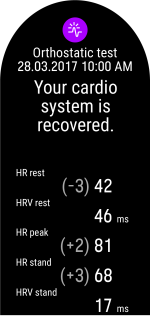 Il test ortostatico è anche una componente integrale della funzionalità Recovery Pro che indica se il sistema cardiovascolare ha recuperato o meno. Il test confronta i risultati del test ortostatico con i valori di base raccolti nel tempo e prende in considerazione anche il recupero soggettivo, nonché la cronologia degli allenamenti a lungo termine.