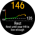 Als het horloge de gewenste herstelhartslag heeft bepaald, waarschuwt het horloge je met een geluid en een trilling en wordt Rust tot je hartslag laag genoeg is weergegeven op het display. Tijdens de rustfase zie je op het display je huidige hartslag en de gewenste herstelhartslag. De stippellijn in de realtime hartslaggrafiek geeft de herstelhartslag aan. De minimale rusttijd is 20 seconden. Als je de gewenste herstelhartslag eerder bereikt, zie je Rust een paar seconden langer uit op het display.