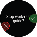 Als je de functie wilt uitschakelen, druk je in de weergave Inspanning-rustgids op de knop TERUG. Inspanning-rustgids stoppen? verschijnt. Druk op OK om bevestigen. Als je de Inspanning-rustgids stopt, stopt de training niet.