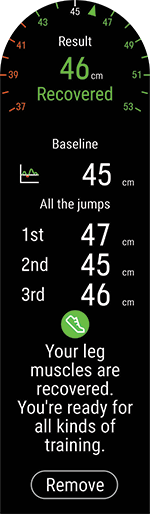 Etter testen får du se hvor høye de tre hoppene var, og gjennomsnittet av de tre hoppene, som brukes til å beregne en basislinje. Du kan vise det siste resultatet ditt under Tester > Restitusjonstest for ben > Siste resultat.