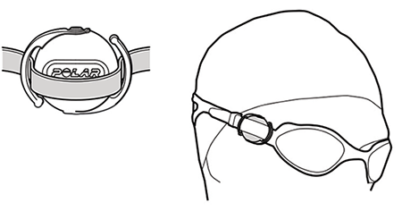 - Bringe die Klammer am Band deiner Schwimmbrille an. Positioniere die Klammer an deiner Schwimmbrille so, dass der Sensor mit der Taste nach oben an der rechten Schläfe anliegt.