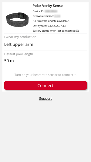 In the Flow app, go to Devices and choose Polar Verity Sense if you have more than one Polar device. At the top of the device page, you will see information about your device, such as the device ID, ANT+ ID, current firmware version, and whether an update is available, as well as the time of the last sync.