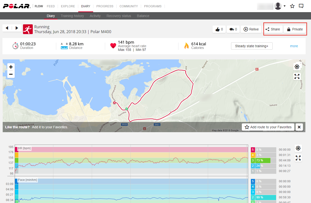 Jos haluat muuttaa yksityisen profiilisi harjoituksen julkiseksi, harjoitus näkyy kartalla, mutta nimesi kohdalla lukee ”Yksityinen käyttäjä”.