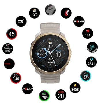 Polar Vantage M3 ウォッチの文字盤をカスタマイズしましょう。前もって定義された一連のオプションからさまざまなスタイルやカラーを選択し、カスタマイズすることが可能です。加えて、文字盤に表示されるウィジェットも選ぶことができます。ウィジェットを使えば、情報を一目で確認したり、各種機能に素早くアクセスしたりすることが可能です。
