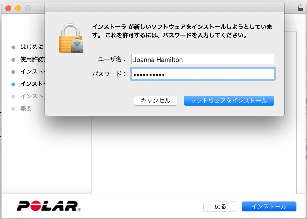 Macユーザーアカウントのパスワードがインストールに必要です。パスワードを入力し、 「ソフトウェアをインストール」をクリックします。インストールが開始します。